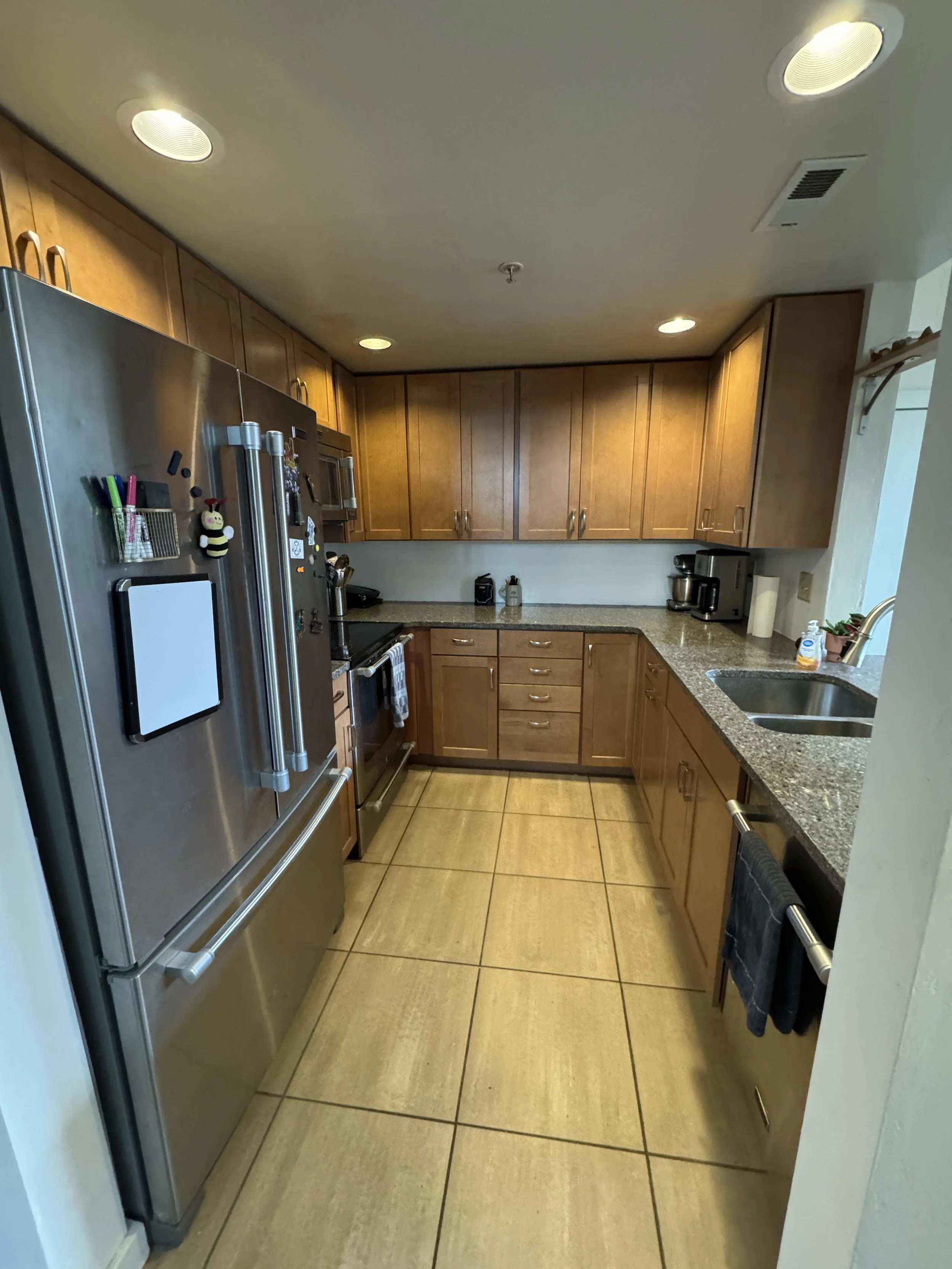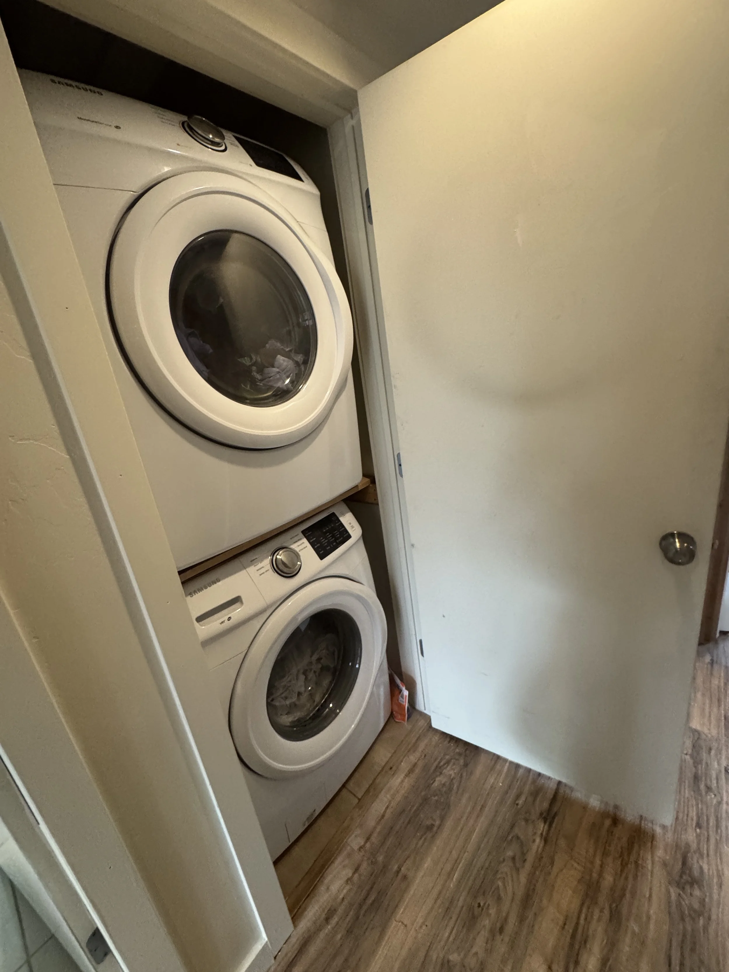 The kitchen is appointed with stainless steel appliances and warm wood cabinetry. Practicality meets comfort with in-unit laundry. Outside, mature trees, shrubs, and thoughtful landscaping provide a serene, leafy backdrop right at your door, blending nature with modern convenience.