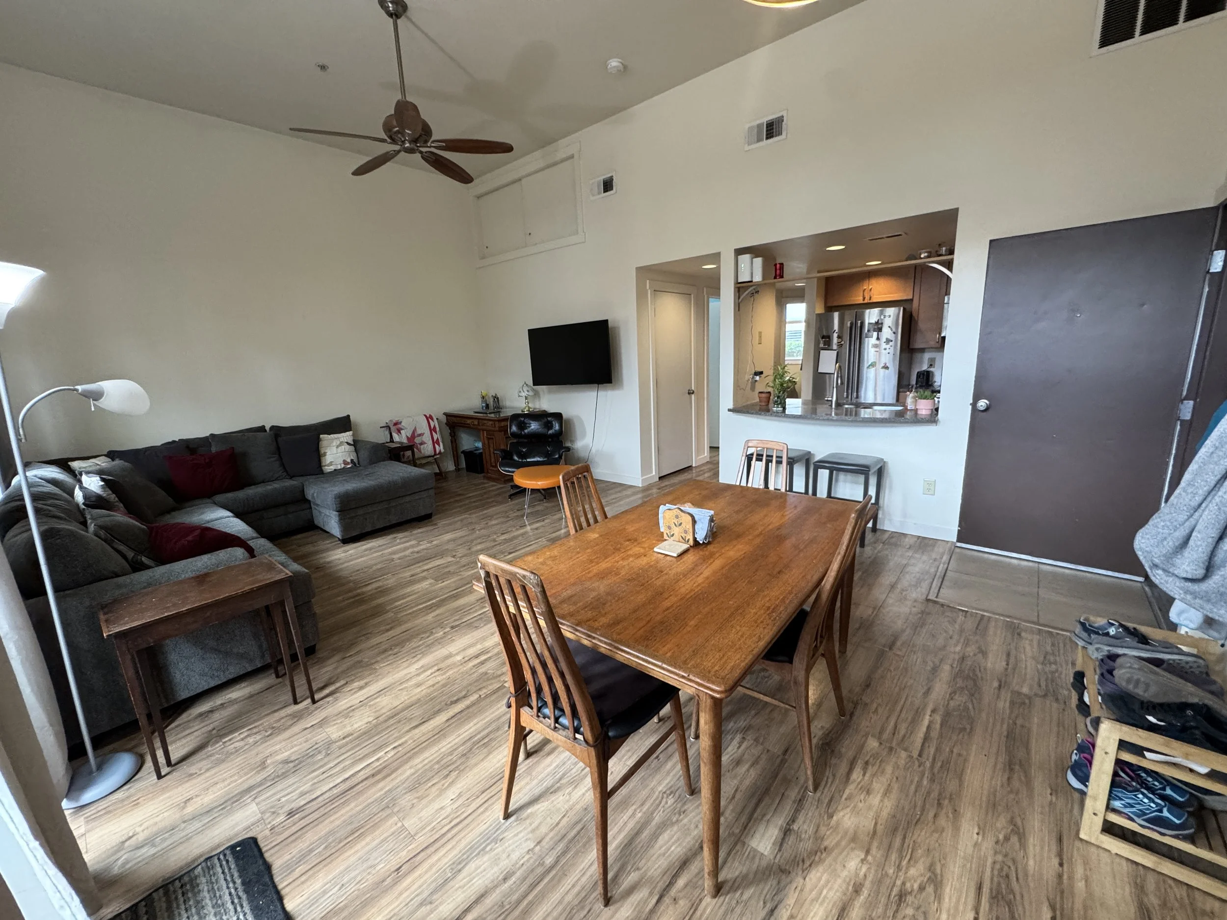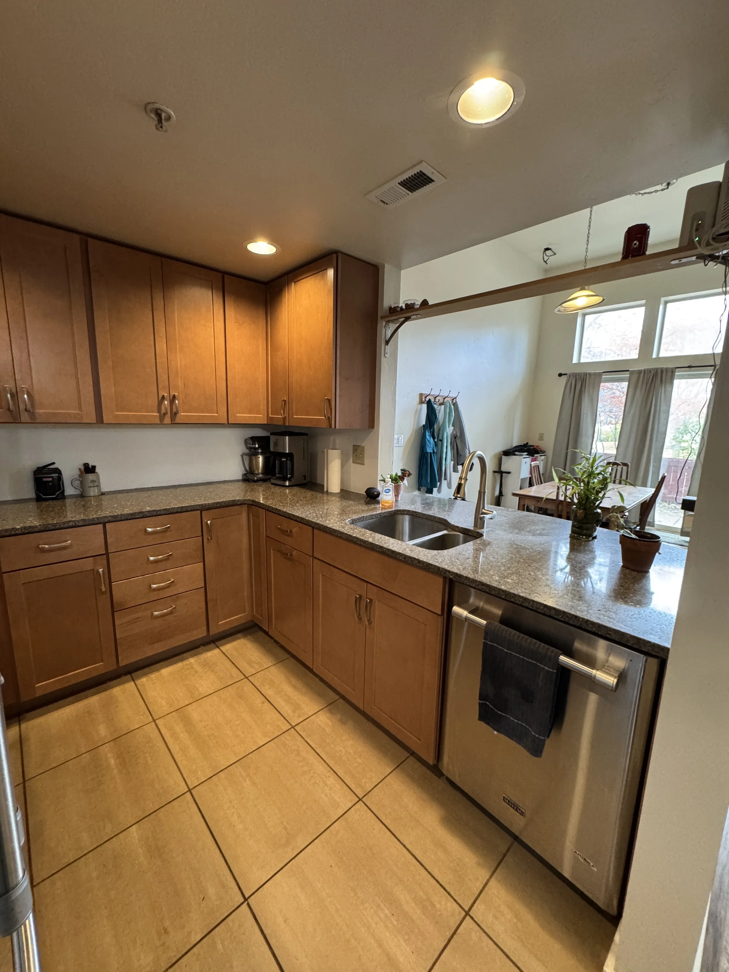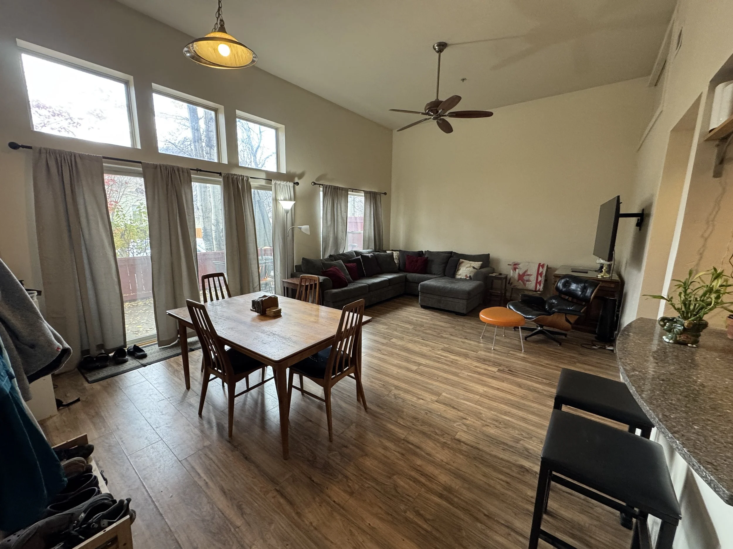 Welcome to a bright and inviting 2-bedroom, 1-bath condo that’s truly move-in ready. Vaulted ceilings and oversized windows create a spacious feel and draw in abundant natural light. The flowing layout ties the kitchen to the dining and living areas, ideal for both everyday comfort and hosting. Step out from the living room to a private patio, perfect for a quiet morning coffee or relaxing after a long day.
