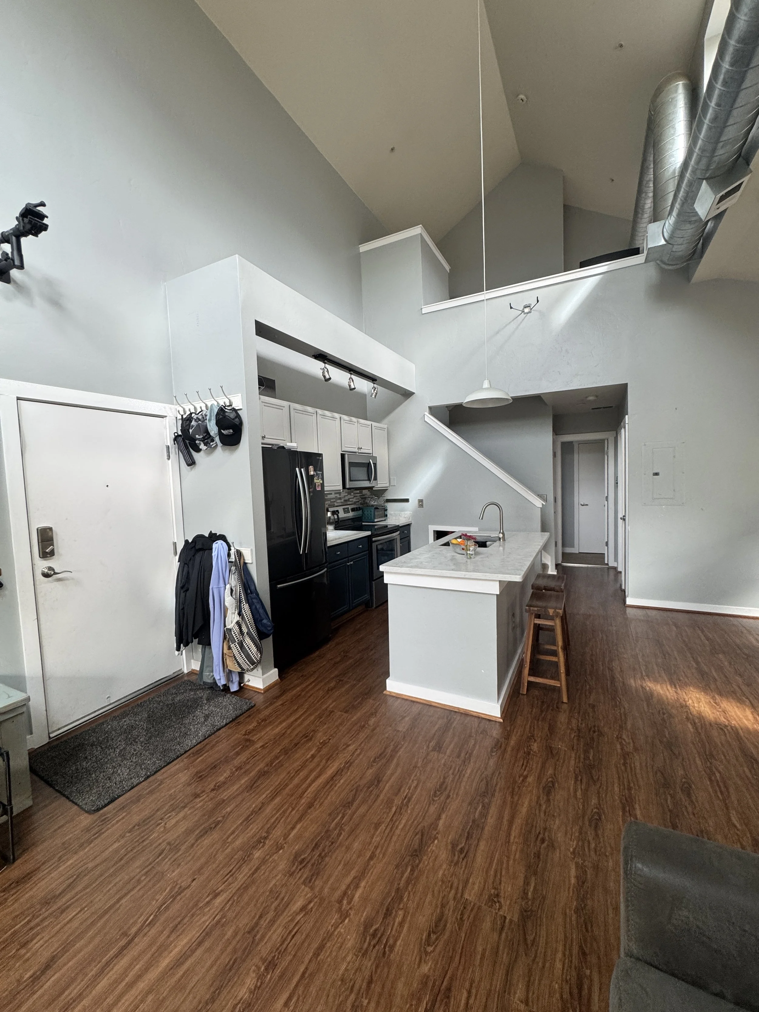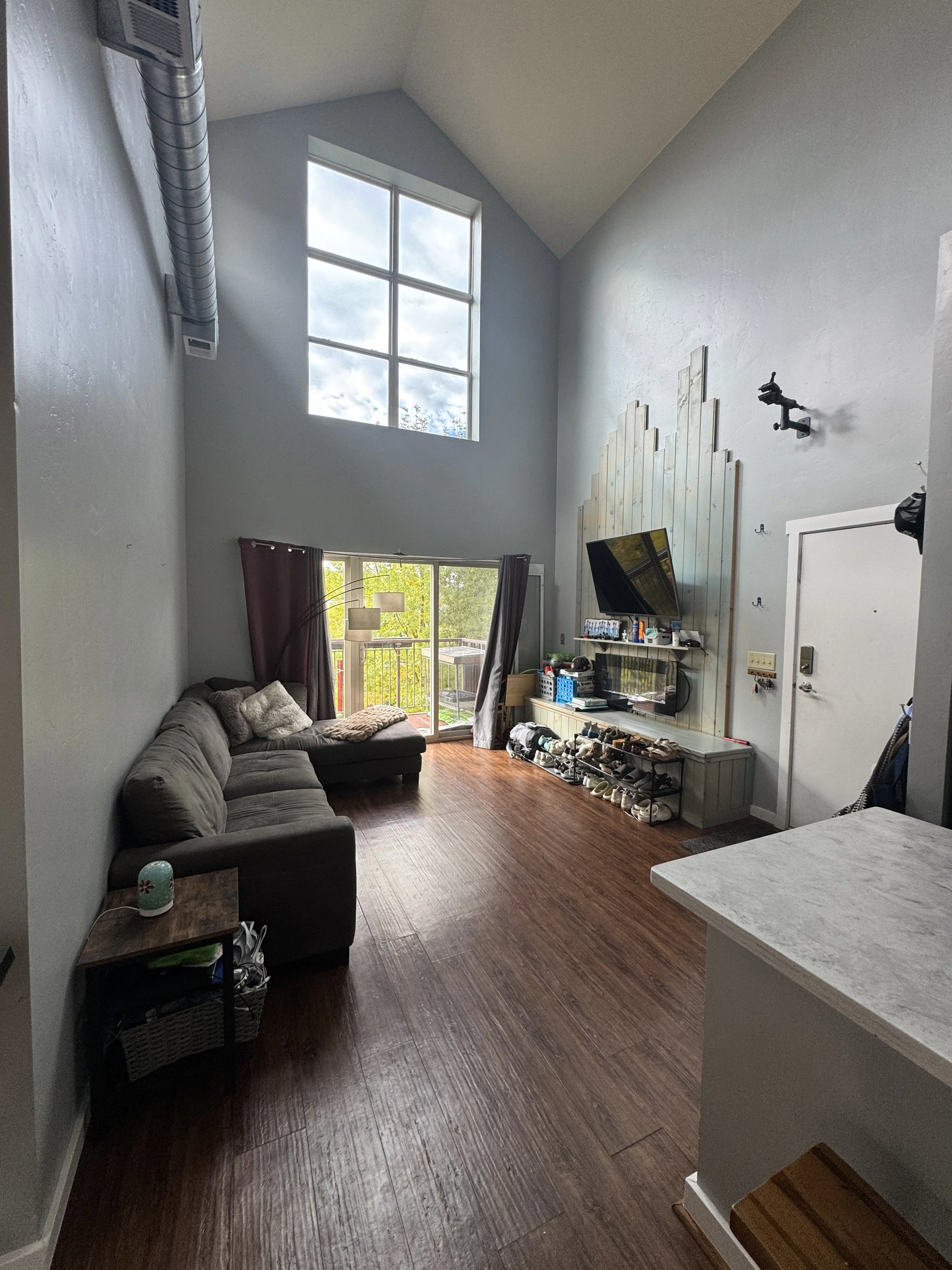 Step inside to an airy, light-filled living space with high ceilings and expansive windows that frame the outdoors and bathe the interior in natural light. The open-concept design seamlessly connects the kitchen, dining area, and living room, extending to a private balcony, ideal for morning coffee or unwinding in the evening.